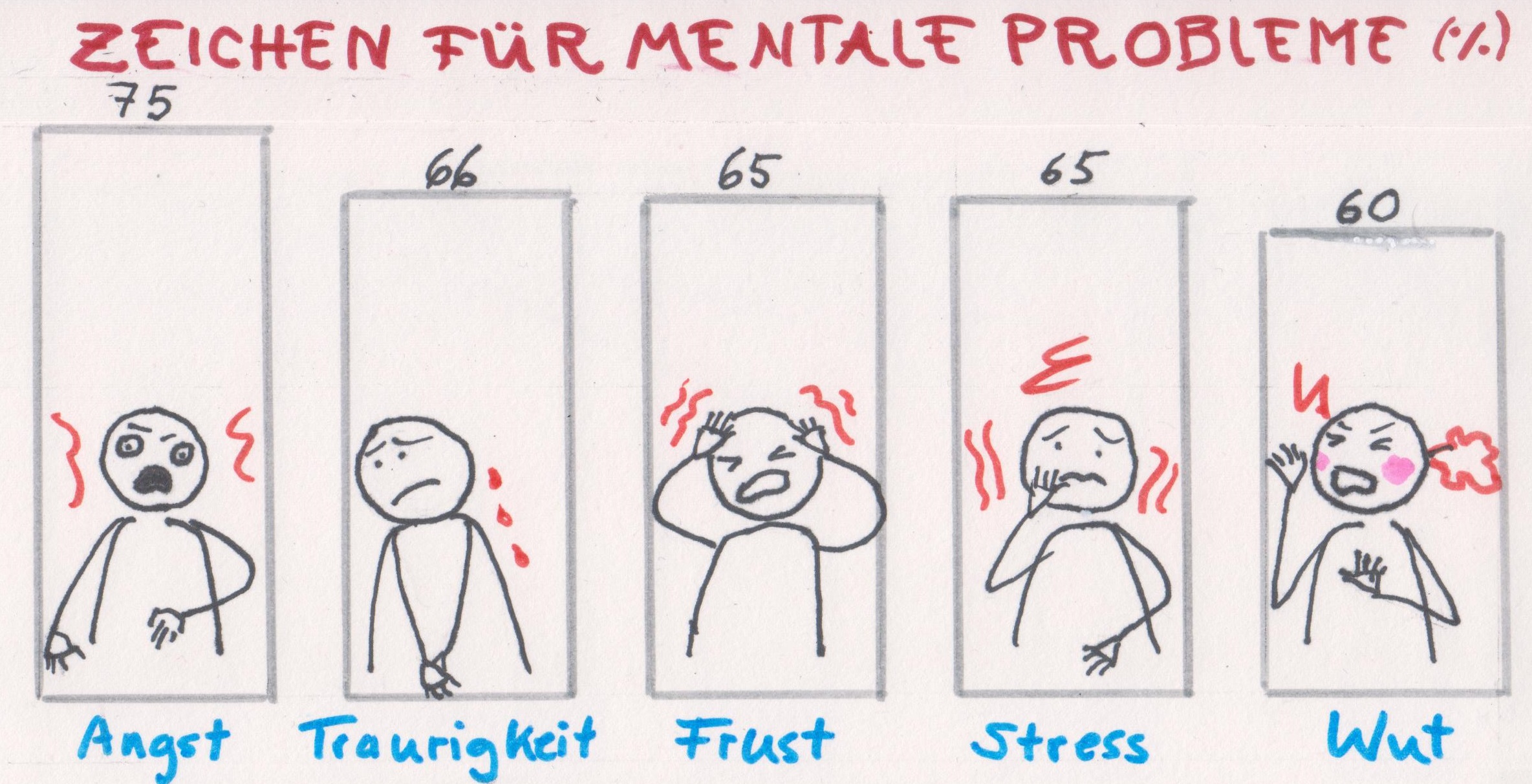 Für rund 80 % aller Befragten ist mentale Gesundheit eine der größten Herausforderungen unserer Zeit. Die wichtigsten Zeichen für mentale Probleme: Angstzuständen (75 %), Traurigkeit (66 %), Frustration und Hilflosigkeit (65 %), Stress (65 %), Wut (60 %).