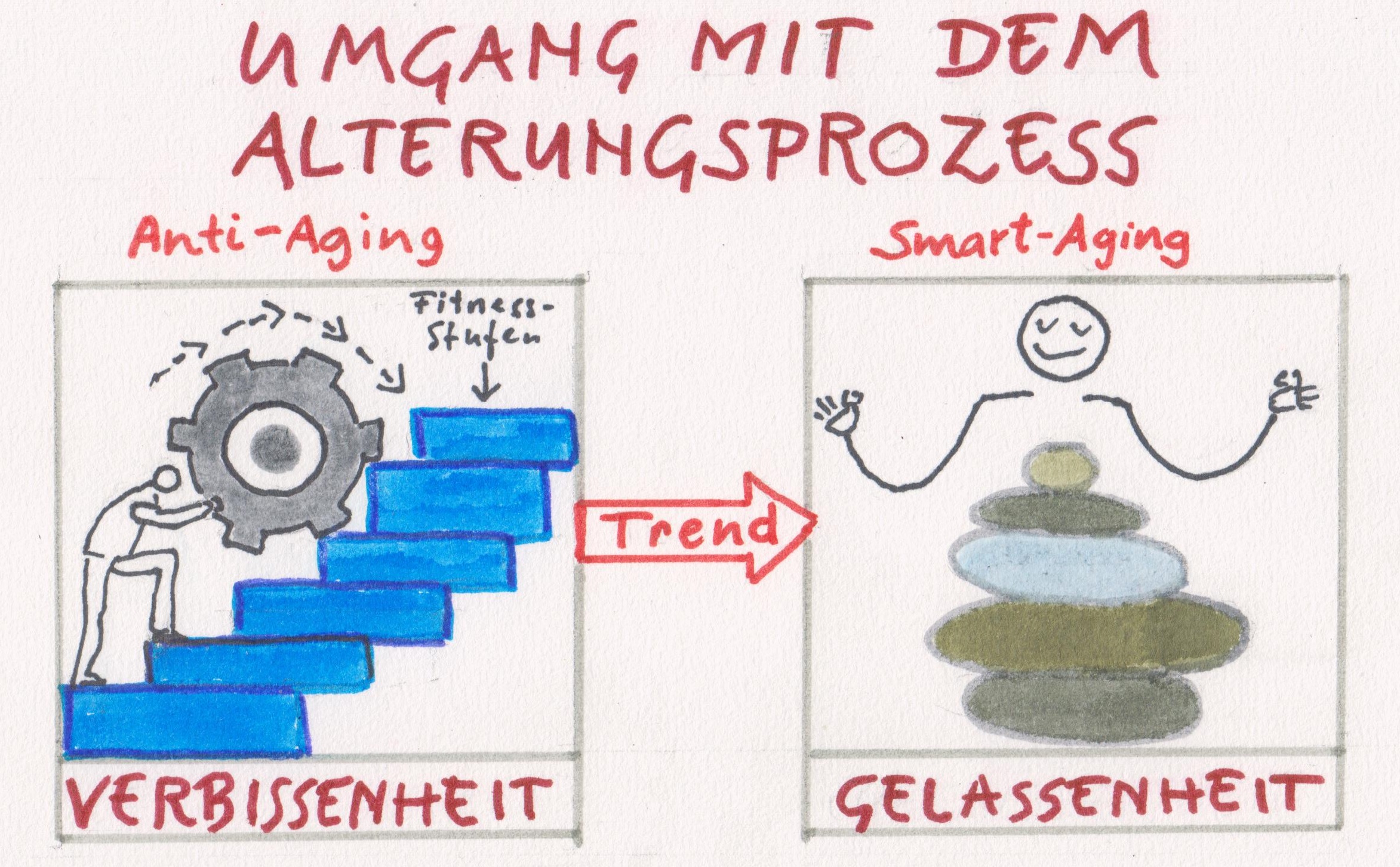 Körperliche Fitness ist in unserer Leistungsgesellschaft zu einem wichtigen Wettbewerbsfaktor geworden. Physische Attraktivität ist ein Erfolgsfaktor für die Karriere und nach der Pensionierung ein optischer Beweis dafür, weiter mithalten zu können. Erste Alterserscheinungen erzeugen deshalb den Druck, sich mit körperlicher Ertüchtigung dagegen zu stemmen. Allerdings gibt es inzwischen einen stabilen Trend gegen obzessives Anti-Aging: den gelassenen, „smarten“ Umgang mit der Realität des Alterns.