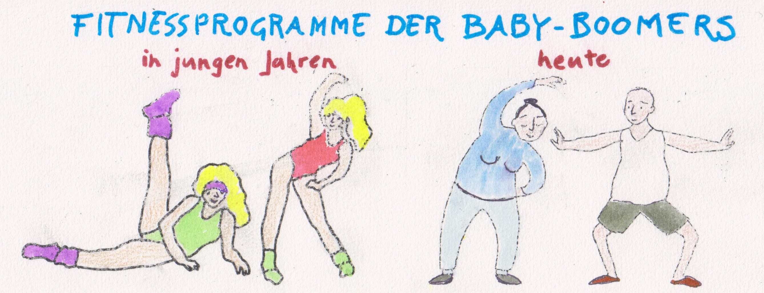 Für jede Generation ist das Alter eine Herausforderung; das gilt ganz besonders für die sogenannten Baby Boomers der heute 55 – 75jährigen, die in ihren jungen Jahren eine neue Jugendkultur begründet haben, die sich später zu einem regelrechten Jugendwahn hochschaukelte und sich vor allem an körperlichen Attributen festmachte. Die Aerobic-Bewegung ist dafür ein bezeichnendes Beispiel: hier ging es nicht mehr nur um körperliche Ertüchtigung, sondern um Sex Appeal und Jugendlichkeit als Ergebnis schweißtreibender Übungen zu anfeuernden Beats.