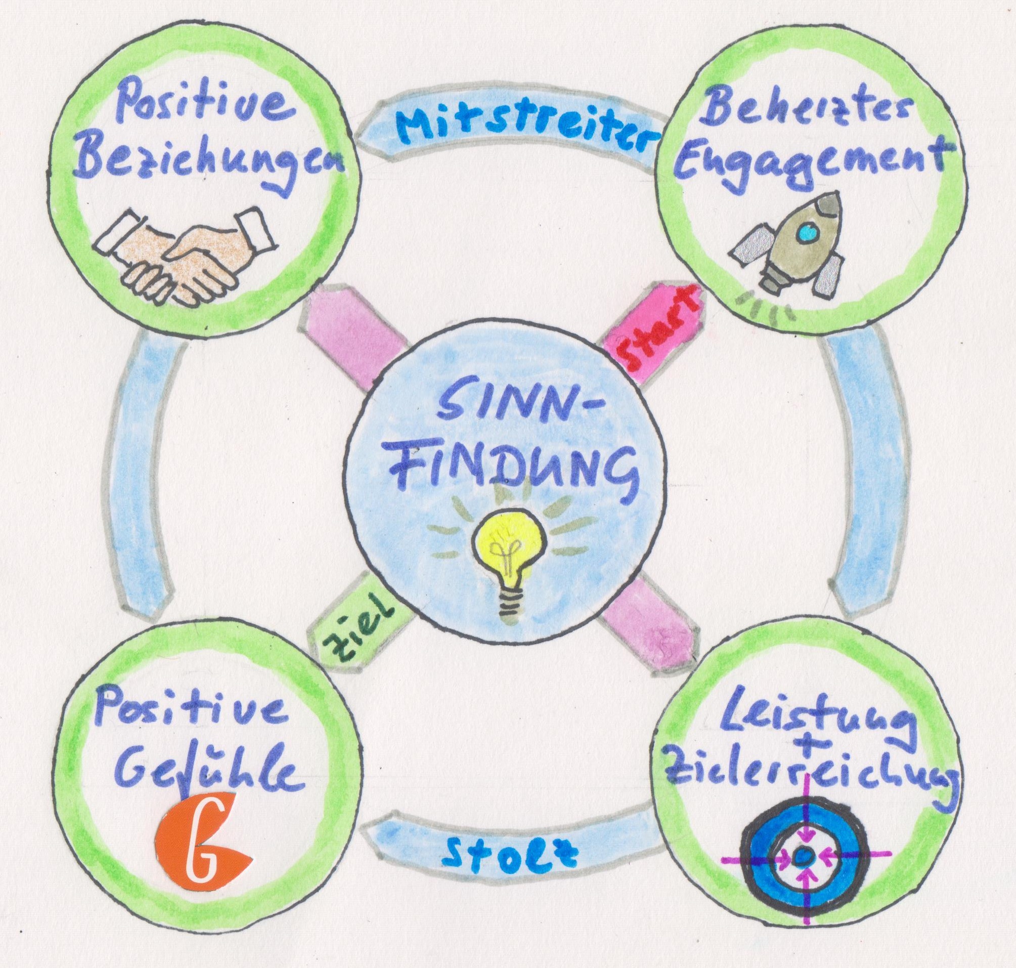 - Das wiederum erzeugt positive Gefühle und beglückende Beziehungen zu denen, mit denen man sich im Sinne der Zielerreichung zusammenschließt.